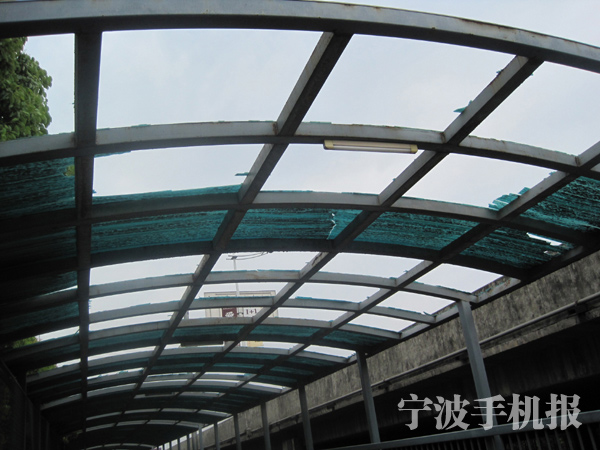 中國(guó)寧波網(wǎng)手機(jī)記者136****6522:東湖花園西側(cè),中興立交橋輔橋本來是安裝了頂棚,但是年久失修,很多頂棚都破爛不堪,甚至還有破掉的碎屑掉下來。晴天不遮陽(yáng),雨天不遮雨,還不安全。本來是一件便民的好事,但是如果沒有后期維修,便民也就變了味!