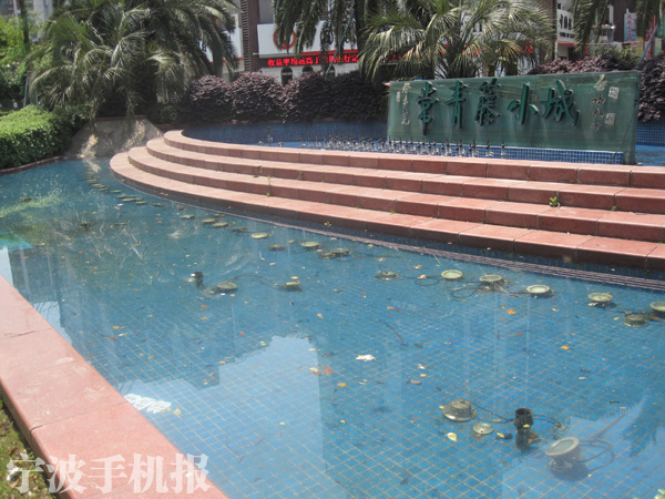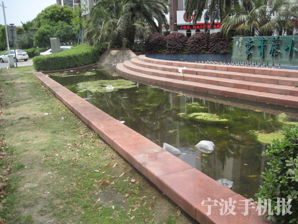4月22日,讀者136****1631反映,江東常青藤小區(qū)大門口前的景觀水池,因長期缺少打理,池內漂浮著許多白色垃圾,池水很臟,長滿了水藻,十分不美觀。