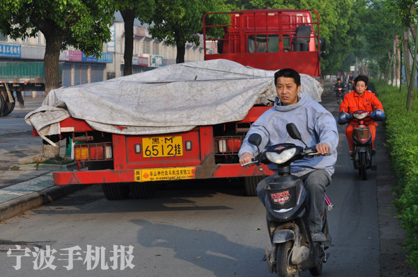 中國寧波網手機記者158****1750:今天上午(28日)一輛“黑M6512”大型掛車違章停放在興寧路與世紀大道口附近一個中石化加油站旁的慢車道上,上班族的自行車被迫駛向快車道,希望司機朋友們切勿亂停放車輛,做個文明禮貌的好司機!