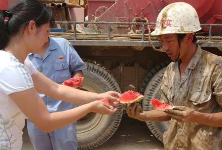 中國(guó)寧波網(wǎng)手機(jī)記者139****8094:五一,是國(guó)際勞動(dòng)者的節(jié)日,五月,又是一個(gè)充滿真情的日子!遞上一塊西瓜,送去了一片清涼,帶去了一片深情!女朋友工地上送來(lái)清涼,男朋友是吃口西瓜甜在心里!工地上的主角們用勤勞的雙手和智慧,不惜揮汗水忘疲倦為甬城地鐵的建設(shè)奉獻(xiàn)著青春的力量。在此,向所有的勞動(dòng)者由衷地道一聲“勞動(dòng)節(jié),你們辛苦了!”