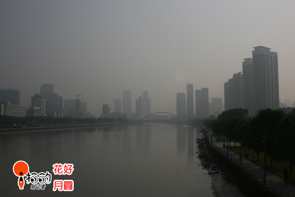 早上7時許,從寧波奉化江上興寧橋放眼三江寧波盛景,雖然今天天氣晴朗,但霧靄層層,整個甬城籠罩在霧靄之中,若隱若現(xiàn)。