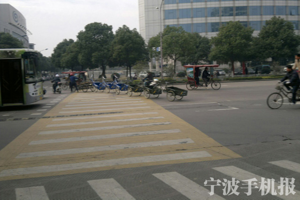 在鎮(zhèn)海車站路與后蔥園路口,有一排三輪車隊過馬路,這時正是交通高峰期,來這樣一幕著實讓人捏了把汗!