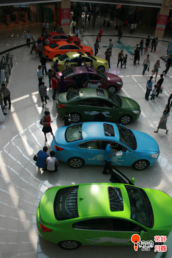 赤、橙、黃、綠、青、藍(lán)、紫,七款不同顔色的別克車排成一排,組成了一道美麗的彩虹。