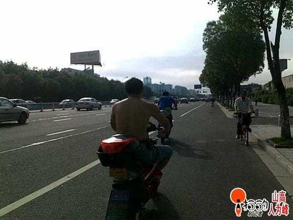 梅雨季,露陽光;天未熱。身先涼;赤膊哥,路上行;礙風景,不文明。6月21日早晨7點半,體育館姚隘路段)