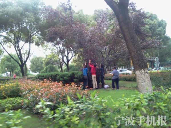 中國寧波網(wǎng)手機(jī)記者135****0503:這是在北侖中河路公園邊上,四個(gè)成年人在拽樹枝摘果子,枝斷樹摧,不文明。