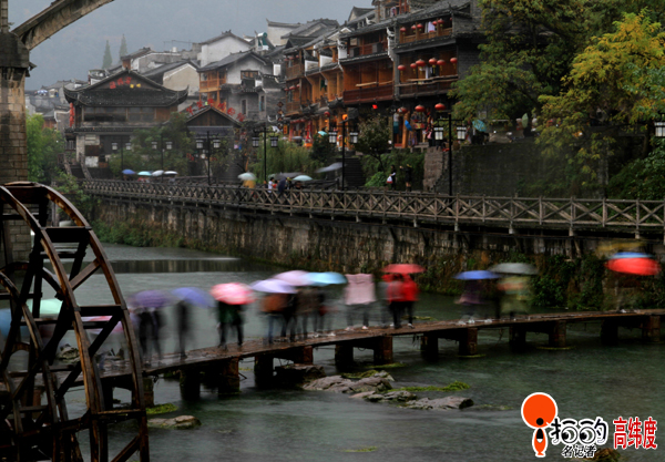 中國(guó)寧波網(wǎng)手機(jī)記者江東-高緯度:雨中鳳凰,纏綿悱惻,朦朧中略帶醉意,令人留連忘返。游人撐著五顔六色的雨傘游走城中,好似一條彩龍?jiān)谟蝿?dòng),給古樸的鳳凰城帶來(lái)了另一番景色。