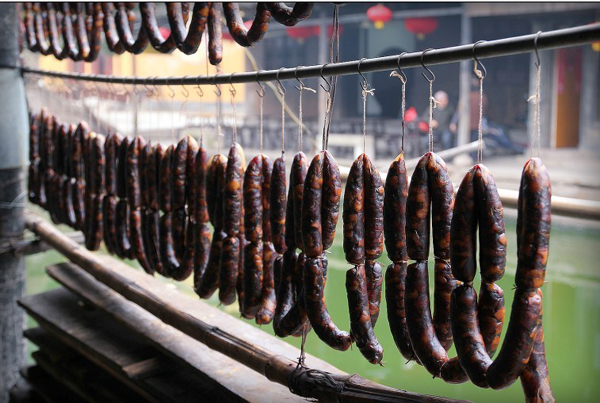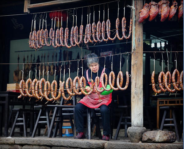 臨近過年,年味越來越濃,一排排的臘腸掛滿了屋檐,煞是好看。