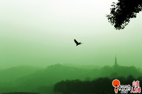 雨中的西湖,山色蒙蒙,一只鳥(niǎo)兒飛翔,天空不留痕跡,卻在鏡頭里定格了一個(gè)美麗的剪影。