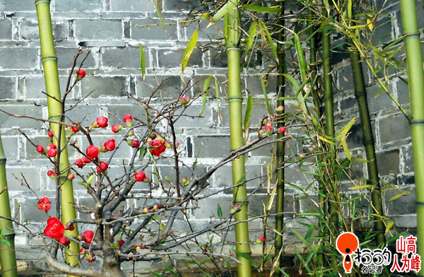 梅在竹前竹相伴,竹在梅旁梅相陪;紅梅花開竹青翠,梅竹相伴報春來!