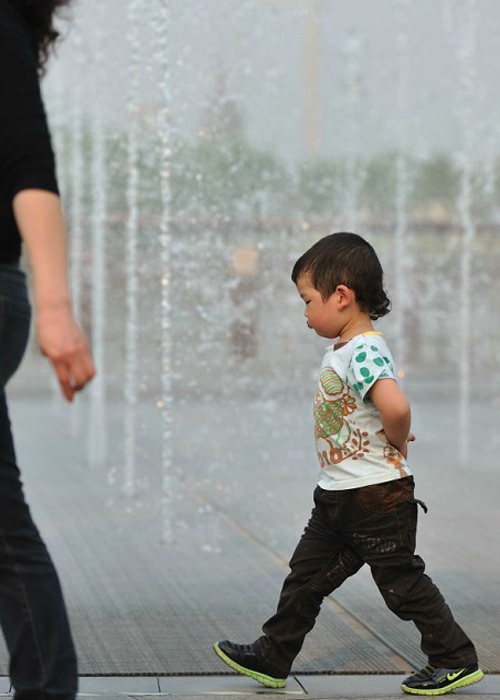 小男孩被媽媽呵斥不能玩水了,氣嘟嘟的跟在大人后面離開(kāi)噴泉池。
