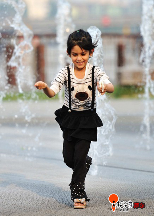 可愛(ài)小女孩在媽媽帶領(lǐng)下玩噴泉
