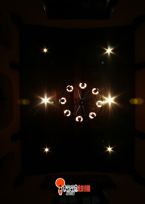 一次去朋友家串門,突然躺在沙發(fā)上仰頭一看,感覺他家的天花板上的燈光太美麗了,就好像夜空的星星和月亮一樣,于是就拍攝了這張美麗的家里的星空!