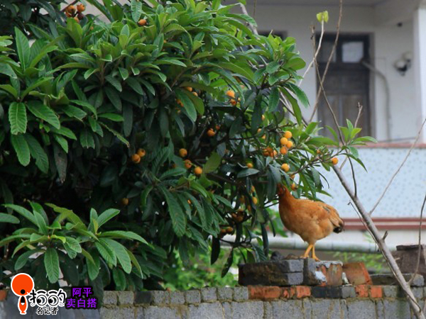 時下正值枇杷成熟季節(jié),瞧,這只雞跳到圍墻上偷吃枇杷了。
