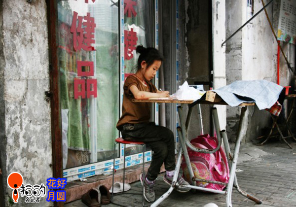 在老鄞奉路上,一家性保健用品店前,小女孩在一張簡易桌上認真寫作業(yè),這樣的場景和背后的保健用品店格格不入,讓人看后有一種說不出的尷尬和無奈!