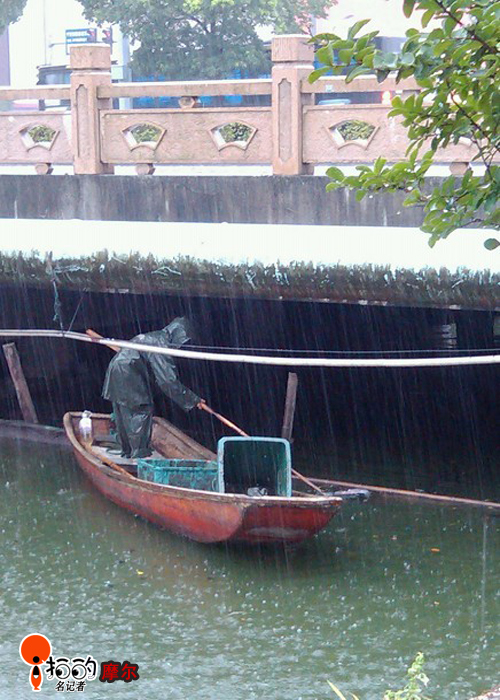 雨中在內(nèi)河撈雜物的清潔工人,往河里亂扔雜物的人看了是不是應(yīng)該改改這個(gè)壞習(xí)慣。拍攝于7月7日