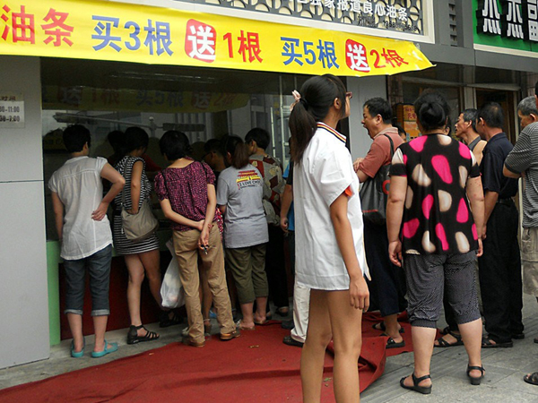 2012.8.5,一家小吃店在進(jìn)行油條促銷,看排隊(duì)的陣勢……筆者想,這活動的“亮點(diǎn)”不僅僅在于“買就送”吧,味道、衛(wèi)生才是吸引顧客的制勝法寶!