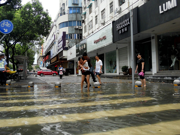 “海葵”走了,卻留下了滿街的積水……甬港南路,一位MM背著GG“過河”,水中見真情,有愛!