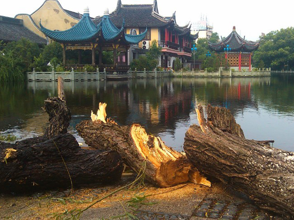 中國寧波網(wǎng)“i拍”記者摩爾:今早經(jīng)過月湖景區(qū),看到一人合圍的大樹也被“?”折倒在地。而湖邊、湖心的走廊也已被暴漲的湖水漫過,儼然成了水下長廊。話說,那位大爺,您可悠著點。