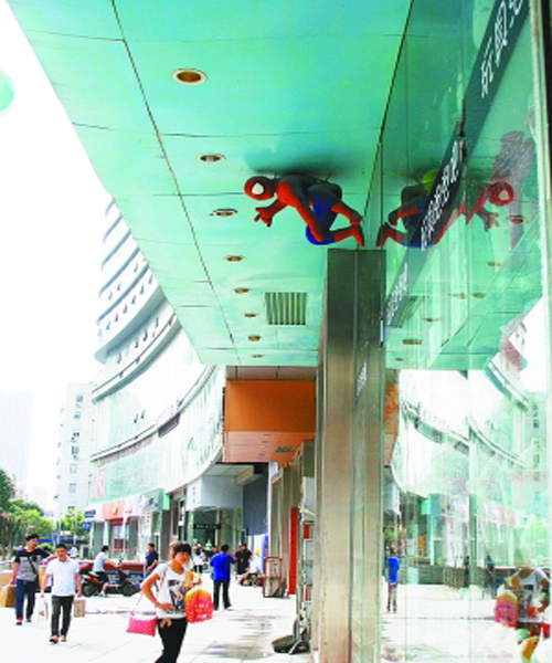 路過城隍廟附近的大來街,突然看到頭頂有一個“蜘蛛俠”!估計這是商家為了吸引眼球而擺的模型,但是路人對此似乎都沒太注意,這個被冷落的“蜘蛛俠”已是滿身灰塵了。