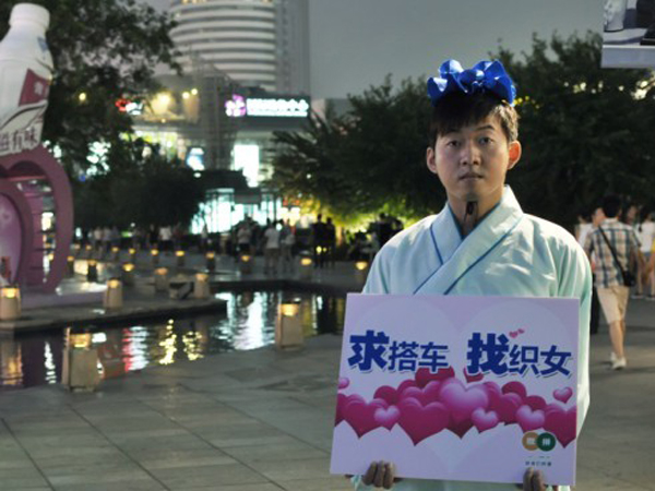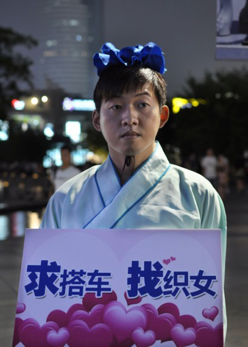 中國(guó)寧波網(wǎng)“i拍”記者狐貍飛::七夕夜,天一廣場(chǎng)驚現(xiàn)一古裝男,“求搭車(chē),找織女”。——小編想說(shuō),這位GG,你還不夠敬業(yè)哦,該把你家阿黃也牽來(lái),這才有誠(chéng)意嘛!