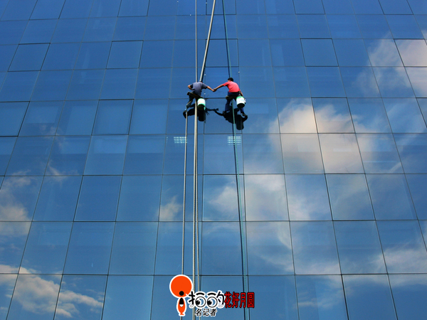 中國(guó)寧波網(wǎng)“i拍”記者花好月圓:也許是天空臟了,擦洗一下吧!兩位清洗玻璃幕墻的“蜘蛛人”正在鎮(zhèn)海經(jīng)濟(jì)開發(fā)區(qū)的北歐工業(yè)園清洗幕墻,那天更好天氣晴好,玻璃幕墻上倒影出來(lái)的藍(lán)天和白云,感覺工人就好像在清洗天空一樣!