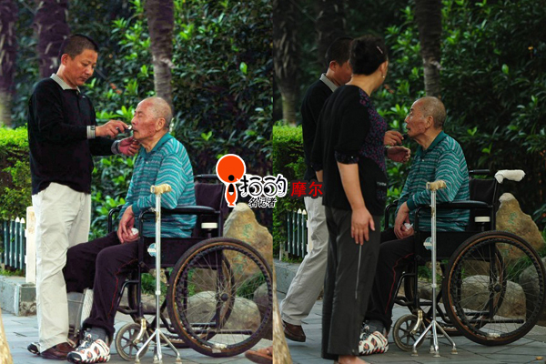 中國寧波網(wǎng)“i拍”記者摩爾:只要天氣好,在月湖畔總能見到一位40來歲的男子推著坐在輪椅上的父親出來呼吸新鮮空氣,一會(huì)幫自己的老父親刮胡子,一會(huì)又給老父親吃點(diǎn)水果,咳嗽時(shí)還幫忙撫背,贏得路人嘖嘖稱贊。
