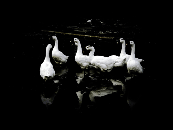 :深院鵝池,不忍戲群,池塘靜悄,疏影流連。