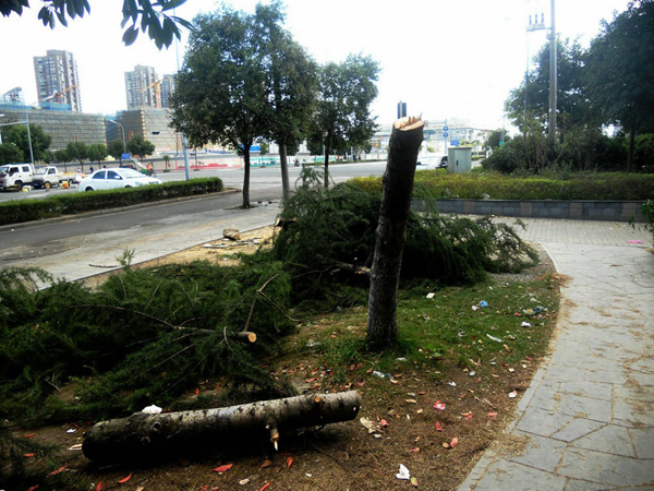 中國寧波網(wǎng)“i拍”記者山高人為峰::鄞州區(qū)學(xué)士路與泰康中路十字路邊,不知要何年才能長成的“參天大樹”,不知何時(shí),不知何因,不知被何人“斬首”了,陳“尸”現(xiàn)場……