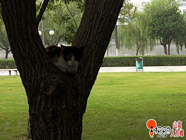 一只貓,蜷縮著身體,蹲在樹丫上,些許發(fā)呆,些許安然,些許恬靜……