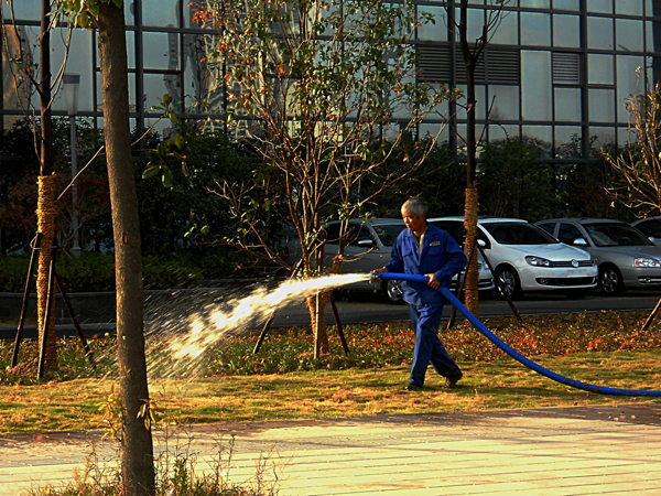 :昨天冷空氣駕到,卻未給甬城帶來一些降雨,下午,園林工人在給路邊的草坪樹壇澆水,以解秋燥干渴。