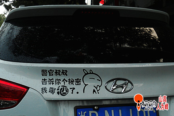 中國(guó)寧波網(wǎng)“i拍”記者山高人為峰:查酒駕,看車貼,警察叔叔怎么辦......當(dāng)下的各種車貼已不僅僅是一種“文化”的俏皮了,更是一種對(duì)現(xiàn)實(shí)的“挑釁”。