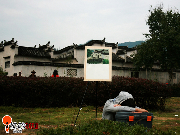 美術(shù)生寫生,畫中的風(fēng)景與身后風(fēng)景交相呼應(yīng)。興許是畫累了,一頭趴在了畫具箱上。