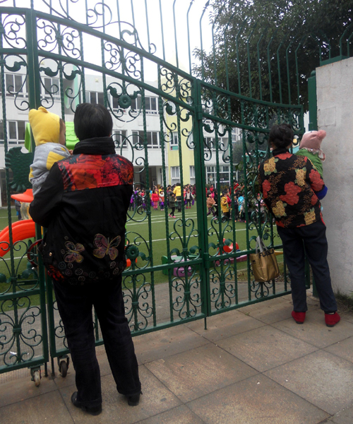 幼兒園里的燦爛童年,姥姥們抱著娃娃,站在門外觀望……有一天,娃娃們也將入園,走進(jìn)這片燦爛。