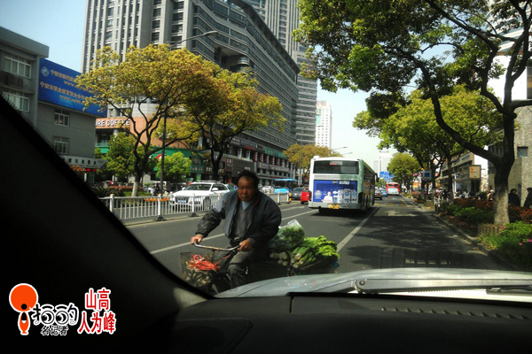 中國(guó)寧波網(wǎng)“i拍”記者山高人為峰:2013、4、10,晴。江東百丈路上,賣(mài)菜大爺?shù)男∪嗆?chē),不僅僅只是逆向,而且是在機(jī)動(dòng)車(chē)道上的車(chē)流中逆向騎行......大爺,你“牛”,我停車(chē)讓你走,行了吧!
