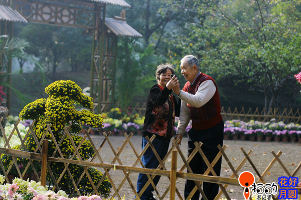 老人用手機(jī)拍到了一叢美麗的菊花而忙拉著老伴欣賞,那種溫馨、祥和、幸福、快樂瞬間定格在濃濃的秋景里!