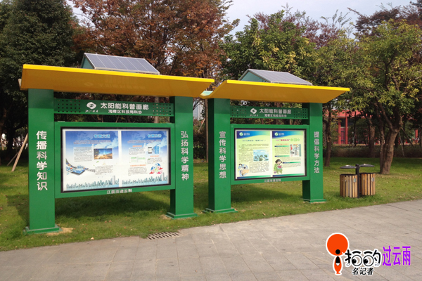 中國寧波網(wǎng)“i拍”記者過云雨:攝于寧波濠河公園。兩座美麗的太陽能科普畫廊正在發(fā)揮它的作用,太陽能科普畫廊頂部安裝了太陽能電池板、感應(yīng)器、蓄電池等配件。太陽能科普畫廊主要采用圖片、漫畫的形式向群眾傳播大量科普知識(shí)。太陽能科普畫廊成寧波宣傳節(jié)能、倡導(dǎo)低碳的一道亮麗風(fēng)景線。