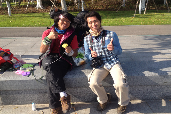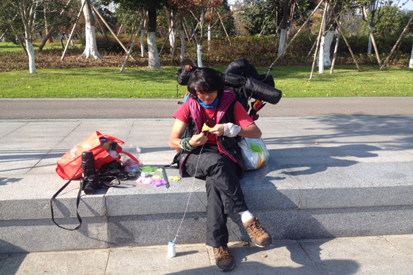中國寧波網(wǎng)“i拍”記者過云雨:12月5日中午,寧波濠河公園里來了一個年輕的背包客,戴著眼鏡斯斯文文,頭上纏著時(shí)尚頭巾,大冷天卻只穿著單薄的短袖,一臉燦爛地笑著。他叫侯群峰,今年22歲,是湖南人文科技學(xué)院大三英語專業(yè)的學(xué)生。在申請臨時(shí)休學(xué)后,他和他的小伙伴林小堅(jiān)計(jì)劃環(huán)游全中國和20個國家,在國內(nèi)要先走完15000公里。問起他的目的,他說要趁年輕好好磨練自己意志,邊走邊了解當(dāng)?shù)氐拿袼孜幕,如果途中遇到需要幫助的人他會毫不猶豫地伸出援手。