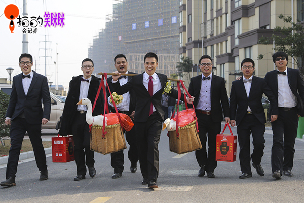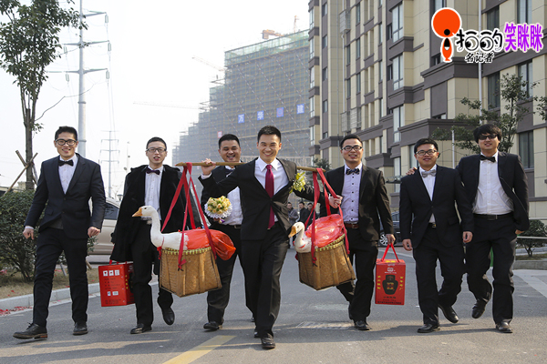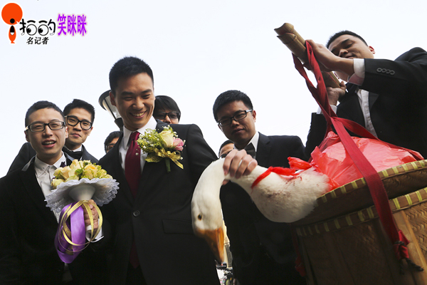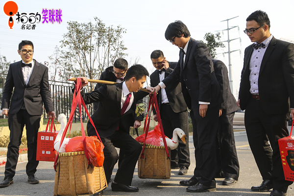 中國寧波網(wǎng)“i拍”記者笑瞇瞇:昨天,在鄞州高橋鎮(zhèn)的一個小區(qū),新郎張先生挑著一對大白鵝,被伴郎們簇?fù)碇ビH。據(jù)了解,新郎新娘都是寧波本地人。新郎挑的籮筐里,除了大白鵝,還有黃魚、熗蟹等物。挑著大白鵝去娶親,原是寧波傳統(tǒng)婚俗,不過如今在現(xiàn)實中越來越少見了。