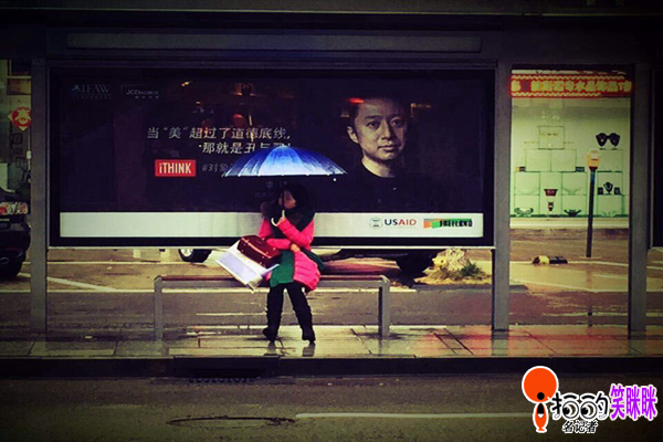 今天下雨,天一廣場公交車站,大幅廣告牌下,紅衣女子在等待......