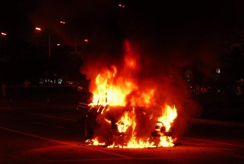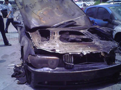 事件發(fā)生地點(diǎn)是位于蒼水街上的聯(lián)誼賓館附近,當(dāng)時(shí)車主張先生正在車內(nèi)休息,睡了一段時(shí)間以后,被濃煙熏醒,感覺(jué)非常悶。睜眼一看,車內(nèi)煙霧騰騰。他趕緊拉開(kāi)車門從車?yán)锾恿顺鰜?lái),但此刻整輛車已烈焰騰空。據(jù)車主介紹,這輛寶馬745Li型是他在2003年花145萬(wàn)多元買來(lái)的,加上稅費(fèi)等費(fèi)用,共花了170萬(wàn)多元。停在邊上的一輛浙A牌照的標(biāo)致206右車門也被燒毀。