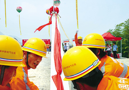 昨天上午,甬臺(tái)溫鐵路電氣化工程寧波東至奉化區(qū)間順利豎起長(zhǎng)9米、重900公斤的首根鐵桿,標(biāo)志著國(guó)家沿海大通道浙江境內(nèi)的重要控制性項(xiàng)目——甬臺(tái)溫鐵路電氣化工程全面展開。該工程由曾參加過青藏鐵路建設(shè)的中鐵電氣化局承建。據(jù)介紹,該鐵路全長(zhǎng)282公里,兩旁需立7956根電氣化桿,全線采用進(jìn)口普拉塞恒張力架線車新工藝,可有效提高接觸網(wǎng)平滑度,為列車高速運(yùn)行打下堅(jiān)實(shí)的技術(shù)基礎(chǔ)。工程計(jì)劃明年1月底建成。