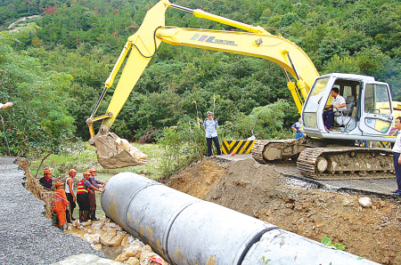 據(jù)負(fù)責(zé)搶修峙后段的象山縣公路段副段長(zhǎng)錢挺介紹,5日深夜,一組路政工作人員趕到泗長(zhǎng)線時(shí)看到,被山洪深深扯裂的一道近6米寬的口子橫亙?cè)诠飞,?米高的路基已被山洪沖得無影無蹤,山洪沖垮柏油公路后直沖入海。為此,幾十位路政搶修工作人員在迅速清理完靠前的大面積塌方后,再用一袋袋裝滿黃泥的編織袋填埋缺口,等到一輛輛載著水泥涵管的車輛陸續(xù)趕到后,各類大型機(jī)械設(shè)備很快投入最后的搶修工作……