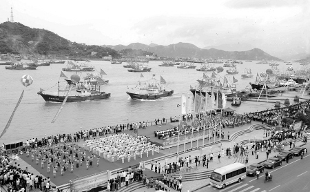中午時分,副市長陳炳水宣布開漁。頓時,一艘艘已經(jīng)起錨的漁輪汽笛齊鳴,在喧天的號角、鞭炮聲中,首尾相接地駛離石浦漁港,向大海遠(yuǎn)處駛?cè)ァ?/p>