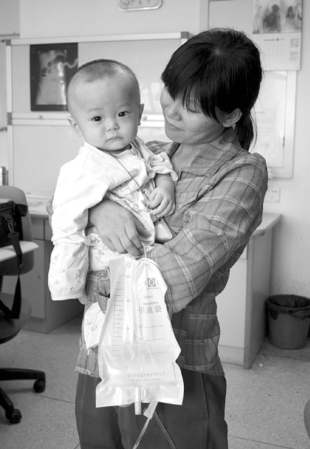 9月16日,有7個月三鹿奶粉喂養(yǎng)史的危重患兒劉星佑在醫(yī)院治療。僅9個月大的劉星佑是廣西醫(yī)科大學第一附屬醫(yī)院收治的首例有三鹿奶粉喂養(yǎng)史患結石病的嬰兒。他5日入院時雙腎、膀胱患有多發(fā)性結石,腎功能衰竭,院方曾發(fā)下病危通知。經(jīng)醫(yī)院10余天奮力救治,嬰兒生命體征基本恢復,下一步將接受手術排石治療。(新華社發(fā))