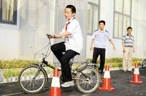 此次考場(chǎng)設(shè)在學(xué)校教室外的空地上。交警將錐桶一字排開(kāi),間隔為2.2米,兩側(cè)用粉筆劃上線,間隔為1.9米左右。學(xué)生騎著自行車(chē),必須在指定的路徑內(nèi)行駛,不得軋線,不得碰樁,腳不能落地,否則即為不合格。