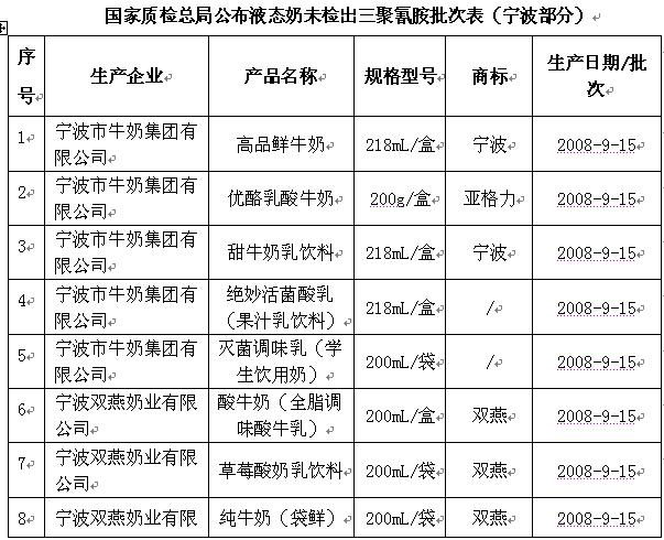 據(jù)了解,所謂的“乳制品”包括液體乳、乳粉和其他乳制品三大類。我市目前尚無乳粉生產(chǎn)企業(yè),液體乳生產(chǎn)企業(yè)共計(jì)3家,分別為寧波市牛奶集團(tuán)有限公司,寧波雙燕奶業(yè)有限公司、寧?h利豐牧業(yè)有限公司!叭鼓谭邸笔录l(fā)生后,市質(zhì)監(jiān)部門立即對上述液態(tài)奶生產(chǎn)企業(yè)進(jìn)行了專項(xiàng)檢查,重點(diǎn)檢查企業(yè)是否嚴(yán)格執(zhí)行進(jìn)貨驗(yàn)收制度、有無使用非食品原料和非法添加物質(zhì)、生產(chǎn)加工環(huán)節(jié)管理是否規(guī)范、是否嚴(yán)格執(zhí)行產(chǎn)品出廠檢驗(yàn)等,同時(shí)對企業(yè)產(chǎn)品進(jìn)行了質(zhì)量抽樣。從現(xiàn)場檢查結(jié)果看,我市液態(tài)奶生產(chǎn)企業(yè)均對原奶的蛋白質(zhì)、脂肪、乳糖、抗生素、菌落總數(shù)含量等指標(biāo)進(jìn)行了投產(chǎn)前檢驗(yàn),并明確生產(chǎn)過程關(guān)鍵質(zhì)量點(diǎn),制定關(guān)鍵質(zhì)量點(diǎn)操作程序和作業(yè)指導(dǎo)書,切實(shí)實(shí)施質(zhì)量控制,產(chǎn)品出廠前都經(jīng)過企業(yè)實(shí)驗(yàn)室檢驗(yàn)并作相應(yīng)記錄。此外,此次檢查未發(fā)現(xiàn)企業(yè)存在使用非食品原料和非法添加物質(zhì)的情況。