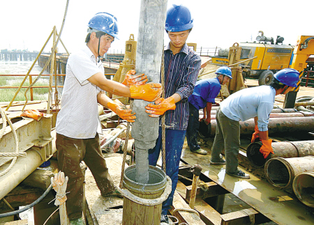 連日來,浙江交工集團400余名建設者加班加點奮戰(zhàn)在梅山大橋各個樁基施工點,確保今年年底前完成樁基和主橋墩工程。梅山大橋為我市重點工程,全長2.2公里。圖為工人們在施工現(xiàn)場進行樁基混凝土灌注作業(yè)。