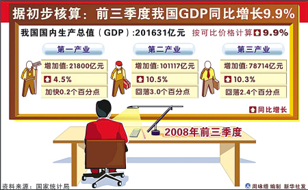 據新華社北京10月20日電 國家統(tǒng)計局新聞發(fā)言人李曉超20日說,據初步核算,前三季度國內生產總值201631億元,按可比價格計算,同比增長9.9%,比上年同期回落2.3個百分點。前三季度,我國居民消費價格總水平(CPI)同比上漲7.0%,漲幅比上半年回落0.9個百分點,其中,城市上漲6.7%,農村上漲7.7%。