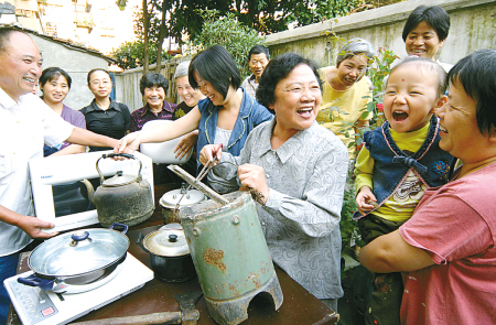 昨天下午,鎮(zhèn)海區(qū)招寶山街道城東社區(qū)居民李欽娣老人(右四),正在向鄰居們講述過(guò)去使用煤球爐的經(jīng)歷。這幾天,該社區(qū)居民正忙著整理煤球爐、煤油爐、火鉗、柴斧、竹瓢、風(fēng)箱等老廚具,為社區(qū)將舉辦的“30年廚房看變化”展覽送上實(shí)物展品。 。êㄈA 朱 聰 程紅霞 攝)
