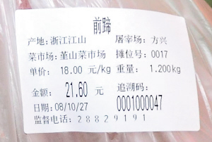 豬肉零售環(huán)節(jié)的IC卡交易系統(tǒng)昨天開始在鄞州堇山菜市場正式投入使用,市民在那里買的每一塊豬肉,都會貼上電腦小票,小票上有菜市場名稱、攤位號、單價、重量、金額等信息,還標(biāo)明了豬肉的產(chǎn)地、屠宰場名稱和一個10位數(shù)字的追溯碼。一旦發(fā)生豬肉質(zhì)量問題,能迅速通過小票知道豬肉來自哪個屠宰場,是哪個養(yǎng)殖戶養(yǎng)殖的豬。